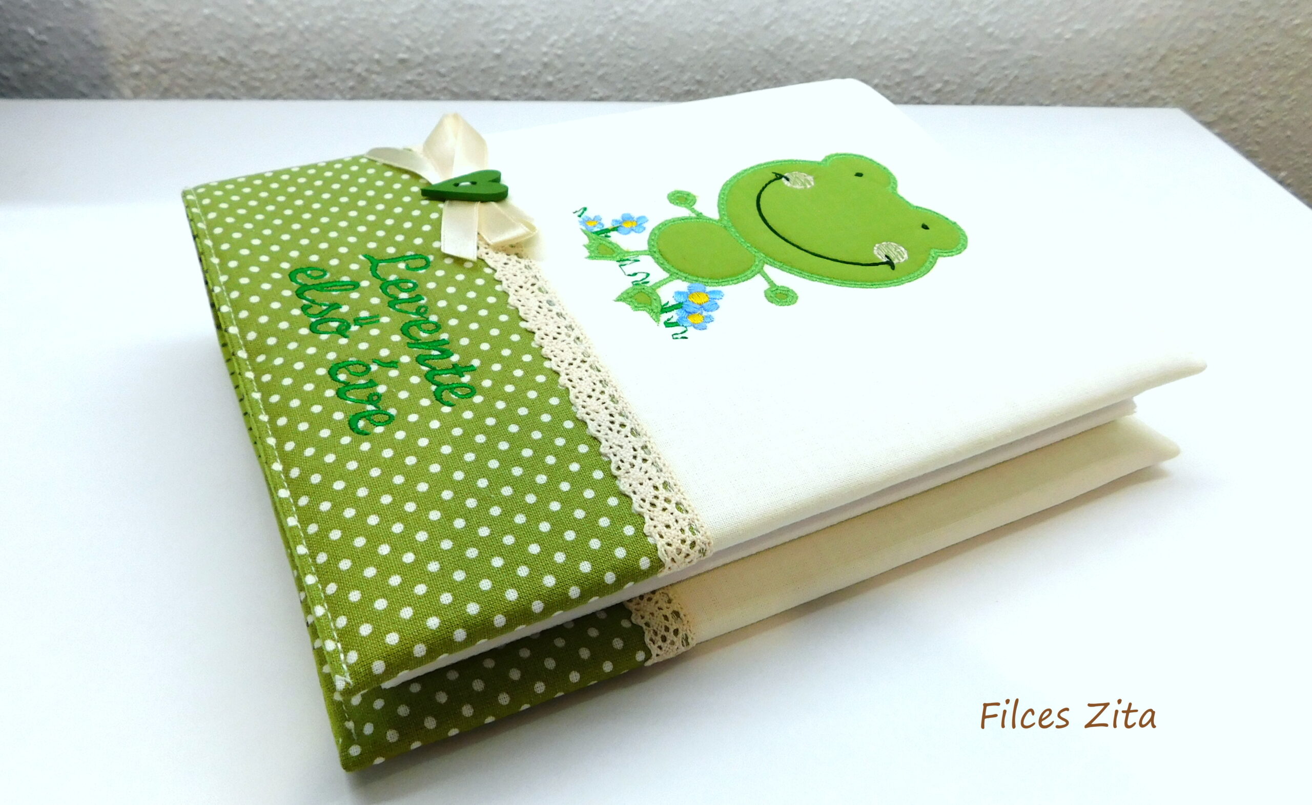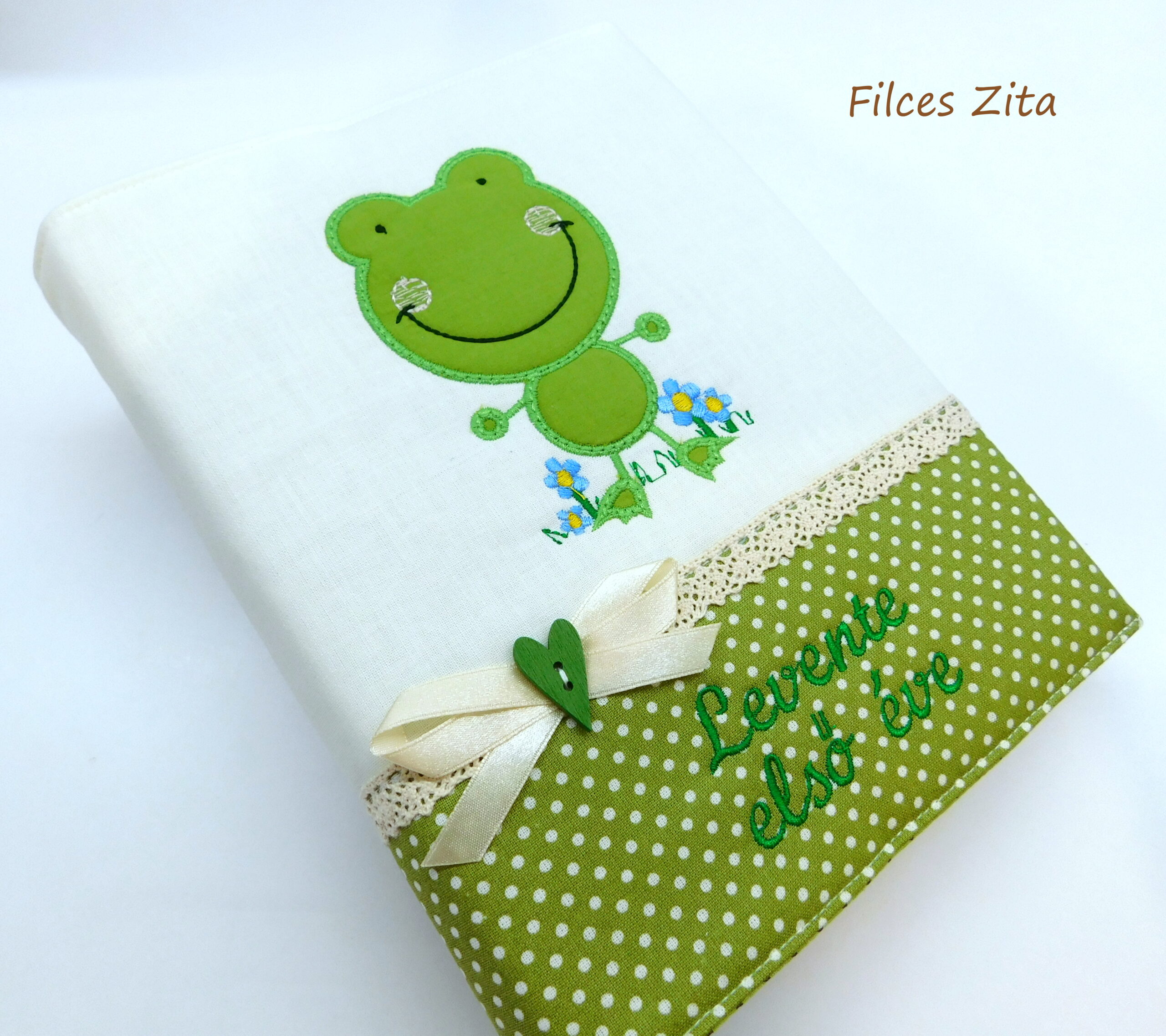 Békás baba fotóalbum hímzett névvel.